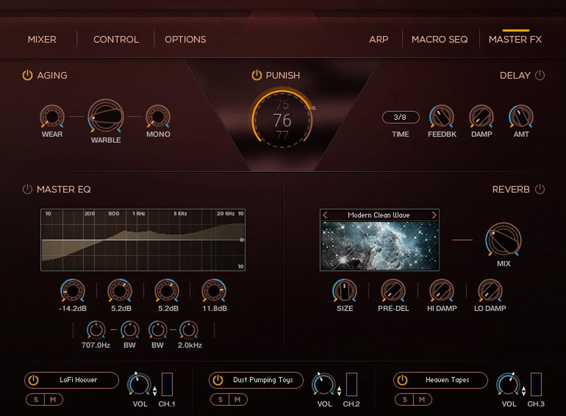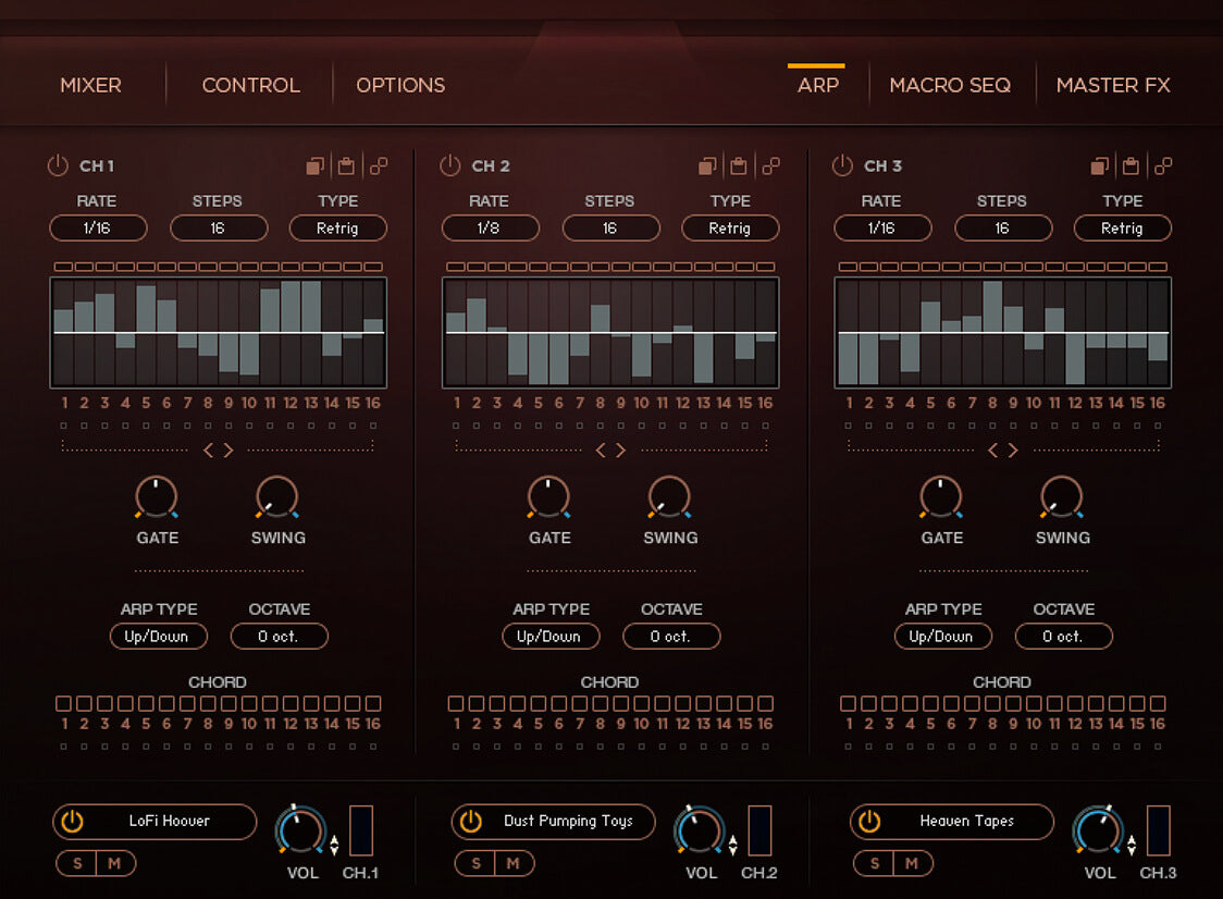Experience thrilling combinations by layering sources across the Mosaic Engine’s three channels or experiment with rhythm, arp, and modulation using the engine's intuitive macros.