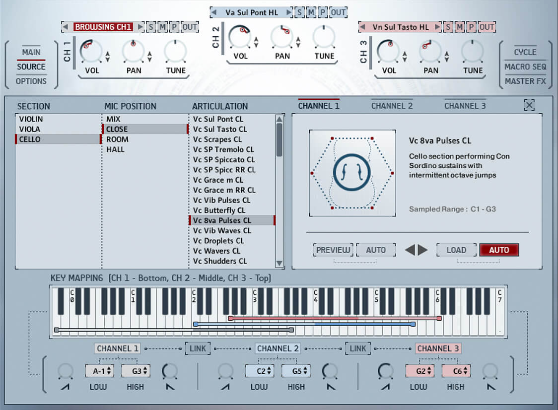 - Celli – 14 Articulations: Sul Pont, Sul Tasto, Scrapes, Sul Pont Tremolo, Sul Pont Spiccato, Sul Pont Grace (minor), Vibrato Pulse, Butterfly Tremolo, Octave Pulses, Vibrato Waves, Droplets, Wavers, Shudders, Overtones