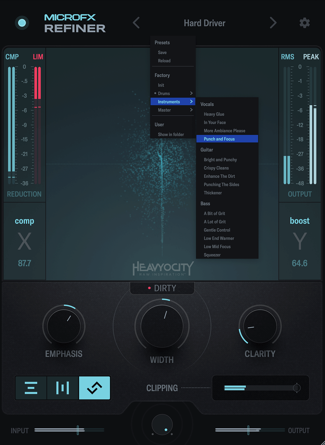 - Emphasis, Width, Clarity, Clipping, and an extra Dirty option provide additional control of your sound